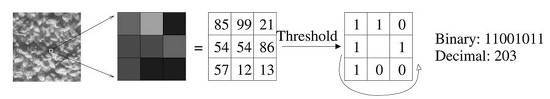 - center pixel을 중심으로 나머지 픽셀들과 크기비교를 한다. center pixel 보다 크거나 같다면 1 작다면 0으로 계산한다.