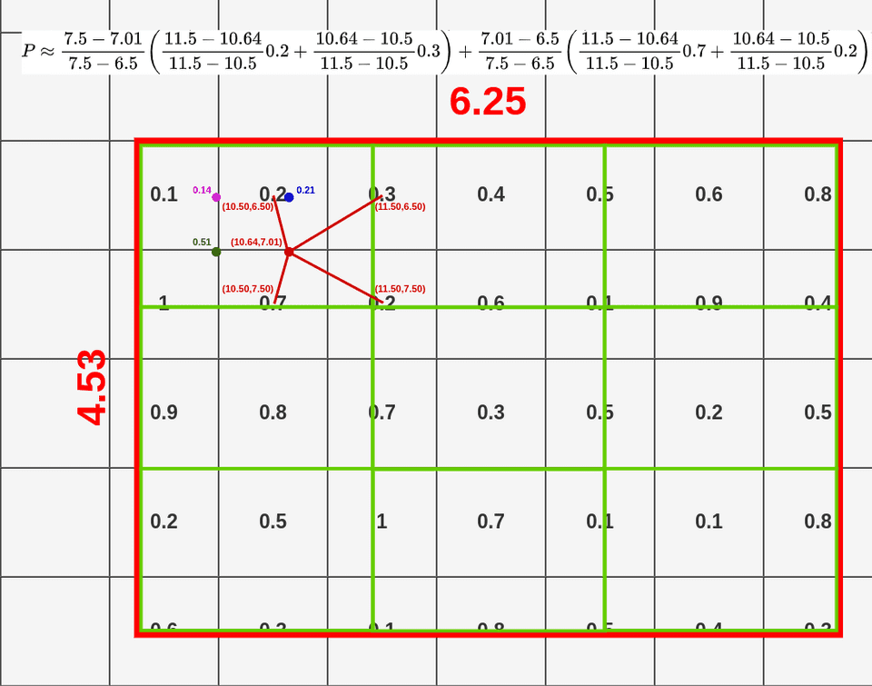 첫번째 box를 보면 6개의 다른 cell을 포함하고 있다. 값을 추출하기위해서는 데이터를 sampling해야한다. 데이터를 sampling 하기위해 아래의 쌍선형 보간 수식을 통해 sampling을 진행한다.