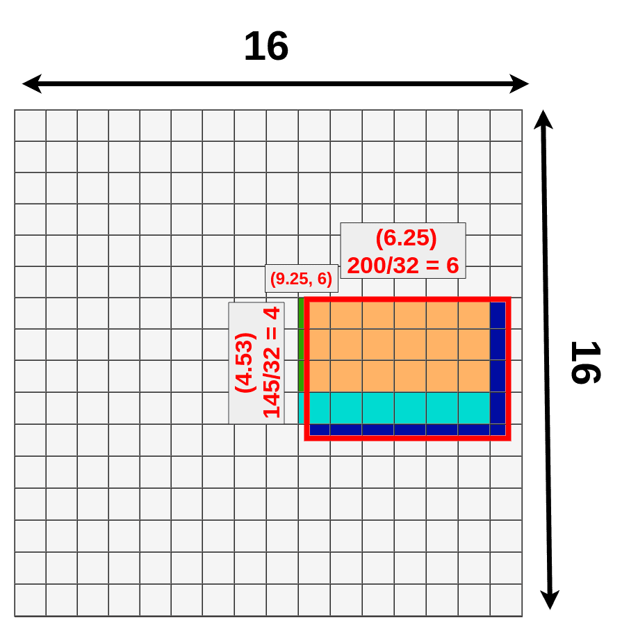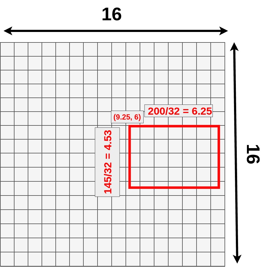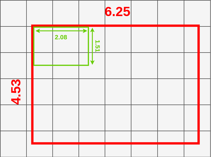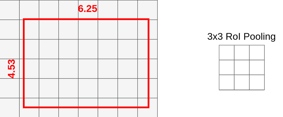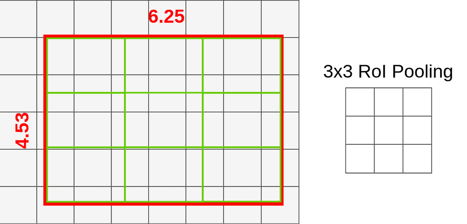 위의 RoI영역을 동일한 크기의 9개의 상자로 나눈다. 현재 3x3 pooling layer를 사용하고 있으므로 mapping된 RoI를 3으로 나누어야 한다. 그러면 아래의 그림과 같이 높이가 1.51이고 너비가 2.08인 box가 된다.