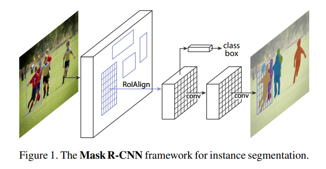 위 Figure 1.과 같이 Mask R-CNN은 기존 Faster R-CNN에서 RoI Align 기법을 통해 얻어진 segmentation mask를 prediction하기 위한 branch를 추가하여 만들어진다.