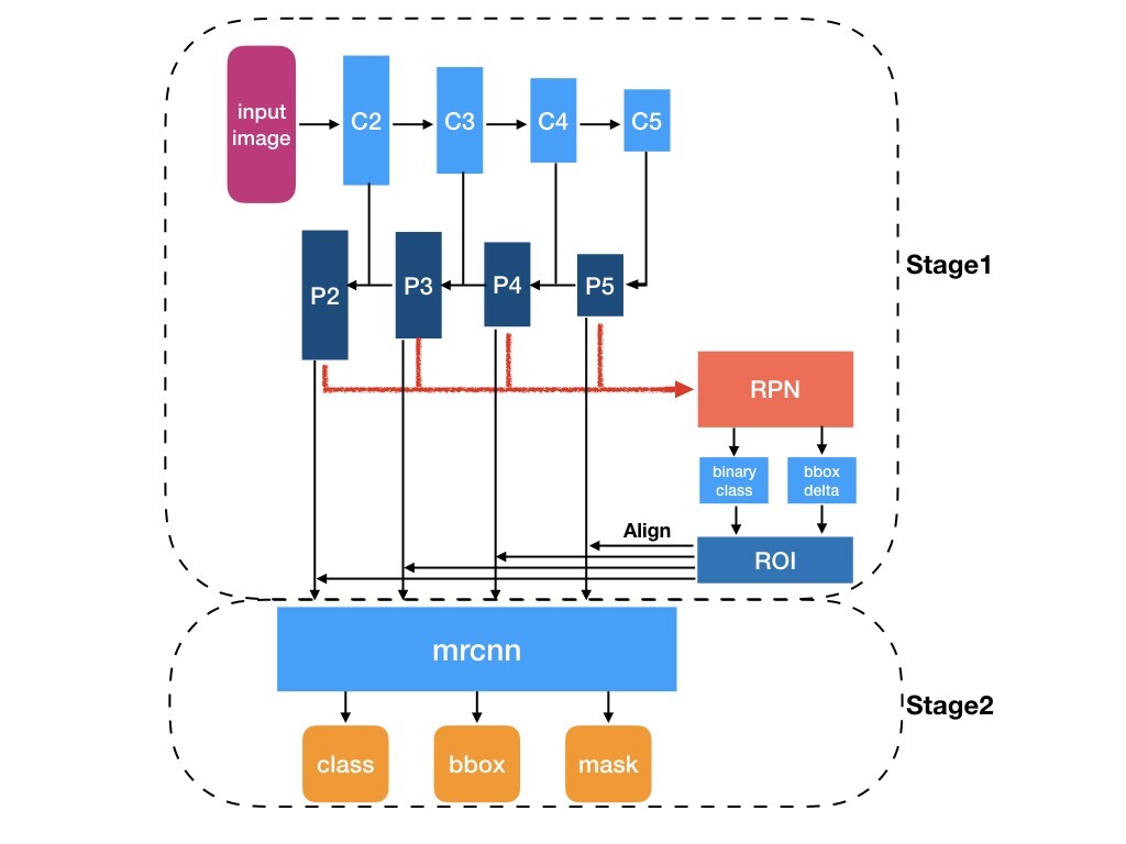 backbone network에서 feature map을 얻는다. 이때, feature pyramid를 이용하여 feature map을 얻기 때문에 P2, P3, P4, P5크기의 feature map을 얻는다. RPN에서 고정된 크기의 bbox를 이용하여 object를 추출(탐색)하기 때문에 크기별로 물체를 추출하기 위해 여러 해상도의 feature map을 RPN의 input으로 넣는다.