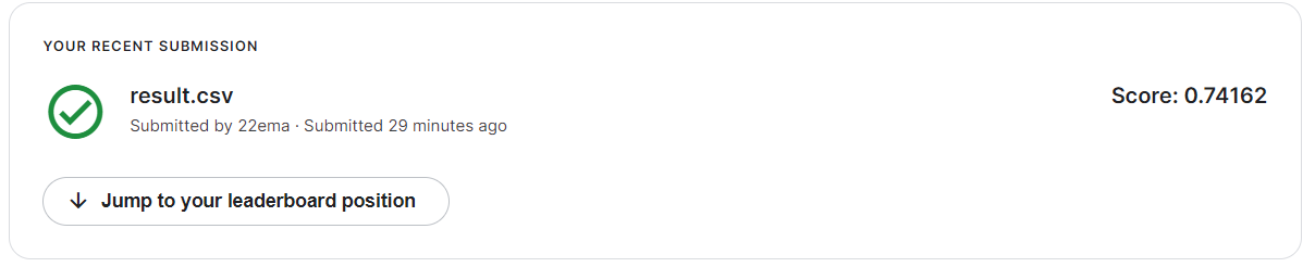 이후 학습과 예측을 실행한 결과 아래와 같은 기록을 kaggle에 달성하였습니다.