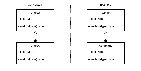 Composition은 채워진 마름모에 화살표가 그려진 모습이다. ClassA는 ClassB가 무조건 존재해야만 구현이되며 서로 생명주기를 공유한다. 즉 Aggregation는 독립적으로 각 Class가 생명주기를 가지지만 Composition은 서로 생명주기를 공유하며 서로간에 무조건적으로 있어야하는 Class이다.