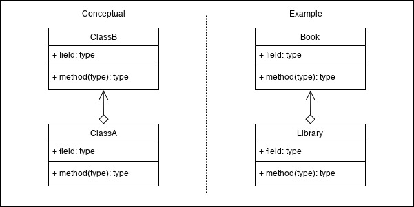 Aggregates(집합)은 위와 같이 빈 마름모와 화살표로 이루어져있다. 말그대로 집합관계를 나타내는데, 둘이 필요관계는 아니라는 게 포인트이다. Library는 꼭 Book이 있어야하는 건 아니며 Book 또한 Library에 있어야하는 것은 아니다.