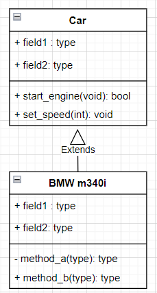 Car 클래스를 상속하는 BMW m340i는 Car 클래스 내 멤버변수와 메서드를 그대로 상속받는다. 기본적으로 Car가 가질 수 있는 속성 및 기능을 Car 클래스 정의하고 Car를 상속하는 다양한 자동차들을 만들면 각 자동차 객체에서 다시 제 구현할 필요가 없어진다!