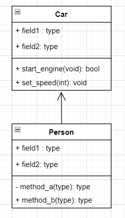 위의 그림에서 Person 클래스가 Car 클래스 또는 Car 클래스의 객체를 사용하기 때문에 Directed Association입니다. 예를 들어 "Person은 Car 엔진의 시동을 겁니다.(start_engine(void))"와 같이 Person이 Car 클래스의 객체 내 메서드를 사용한다.