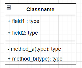 위 그림은 UML 다이어그램에서 작성되는 class의 예시이다. field는 멤버변수, method 는 메서드를 나타낸다. 멤버변수와 메서드는 public과 private으로 외부에서는 해당 변수값을 직접접근 하지 못하도록 제어할 수 있는데 이는 현재 UML 다이어그램과 상관이 크게 없는 내용이기 때문에 생략하겠습니다. 궁금하신 분들은 한번 직접 찾아보시는 것도 좋을 것 같습니다.